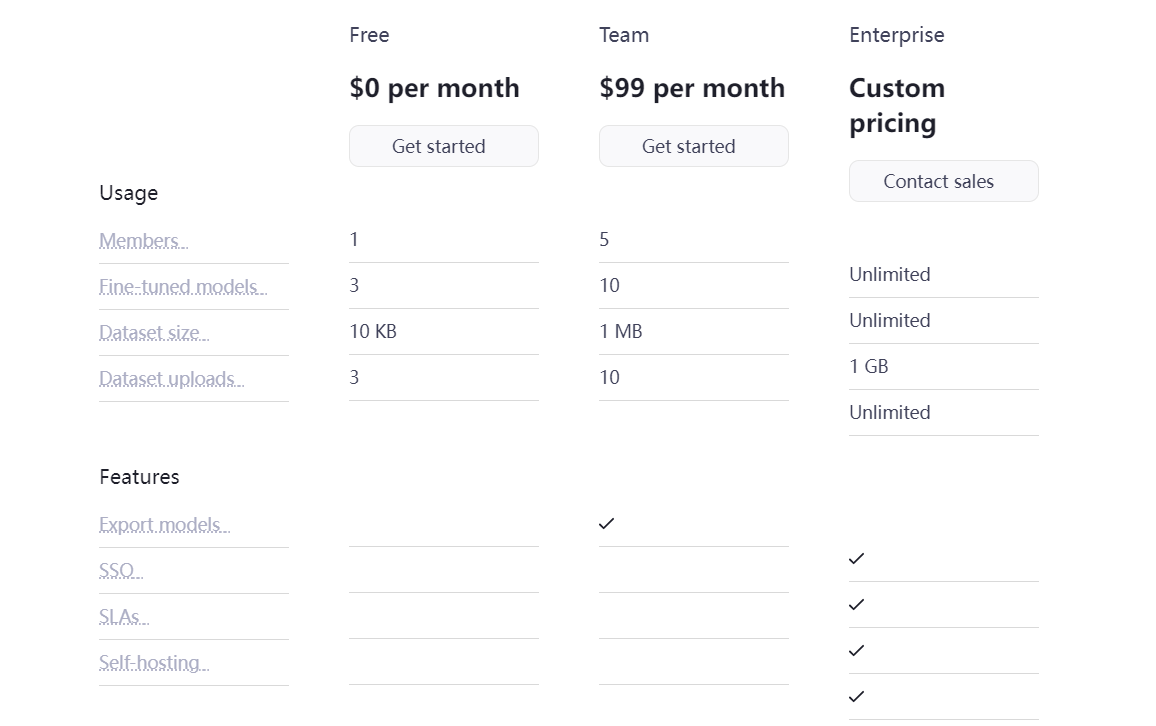 1. Free(免费版):每月0美元,适合1名成员,提供10 KB的数据集大小,允许3次数据集上传,包含导出模型和单点登录(SSO)等基础功能,但不提供服务水平协议(SLAs)和自托管(Self-hosting)。