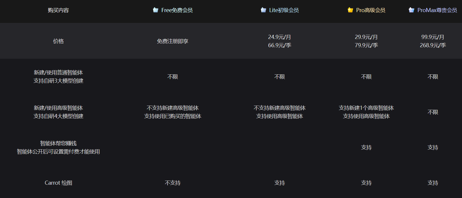 Gnomic目前有4种不同的订阅模式,分别为Free免费会员、Lite初级会员、Pro高级会员、ProMax尊贵会员四种;四种模式都可以免费使用智能体自研模型,如需绘图功能则需升级为初级会员或更高;如需自创模型并获取收益,则需要开通Pro高级会员或更高版本。