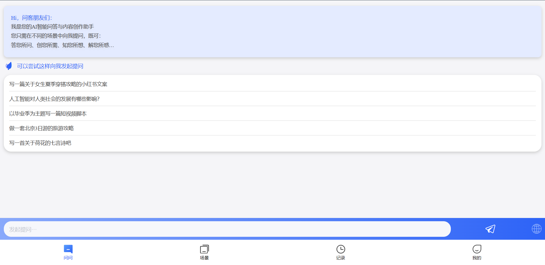 内容创作者:对于内容创作者来说,AI问客可以作为一个创作灵感库和写作助手,提供创意激发、文章润色、续写校对等功能,帮助他们提升创作效率和质量。无论是写手、编辑还是自媒体运营者,都可以从AI问客中受益。