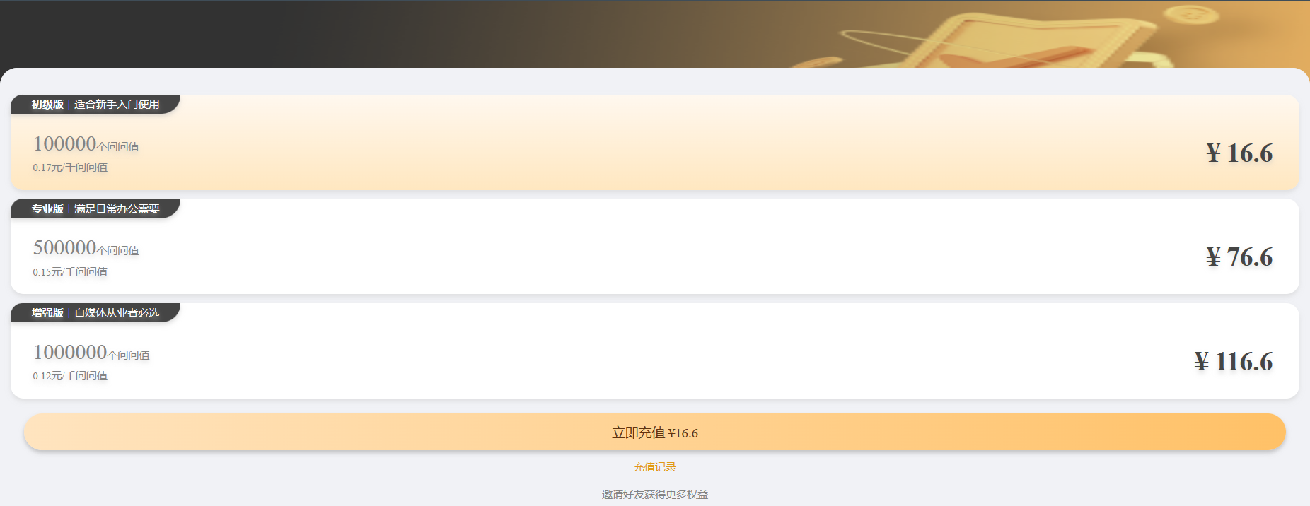 AI问客的定价采用问问值结算,目前有三个价位的套餐可供订阅,分别为初级版、专业版、增强版;分别对应新手入门、日常办公、自媒体从业者三种需求。用户可根据需求选择合适的套餐订阅。