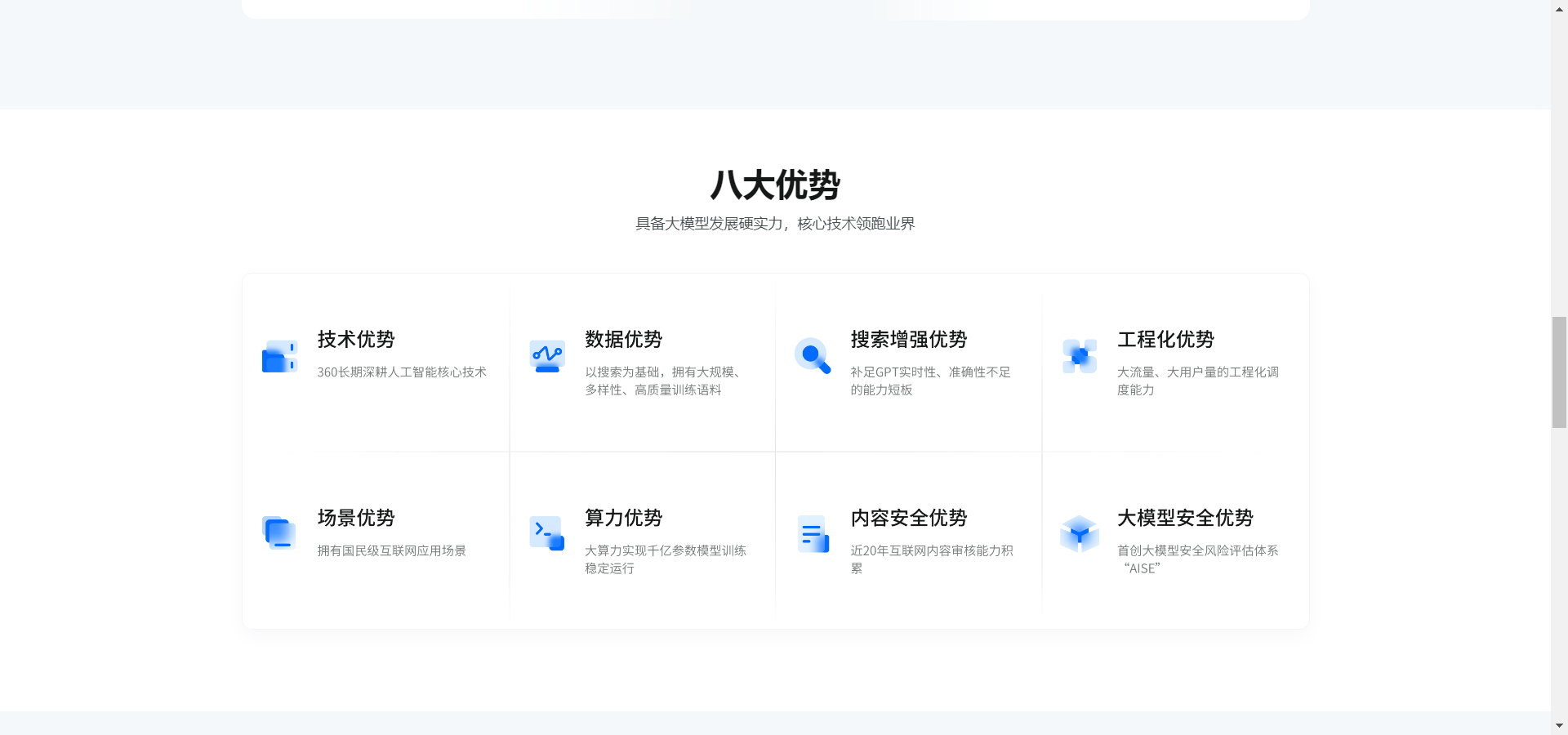 大模型安全优势:360智脑在大模型安全方面也表现出色。它采用了先进的安全技术和加密算法,保障企业数据的安全性。同时,360智脑还首创了大模型安全风险评估体系“AISE”,为全球大模型安全赋能。