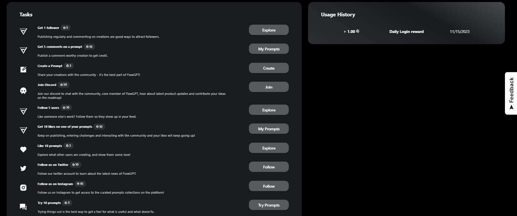 积分在FlowGPT中扮演着至关重要的角色,是使用平台功能的关键。用户可以通过多种方式赚取积分,其中包括最简单的方法之一:每日登录即可获得25个免费积分。这意味着用户越经常使用FlowGPT,积累的积分就越多。