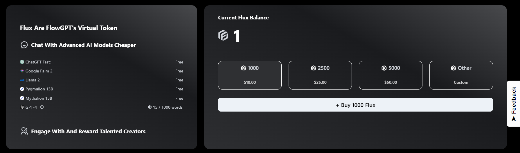 此外,用户也可以选择通过充值购买积分,以便更灵活地利用平台功能。这个积分系统为用户提供了灵活性和便利性,让他们无需支付费用就能畅享FlowGPT的所有功能。