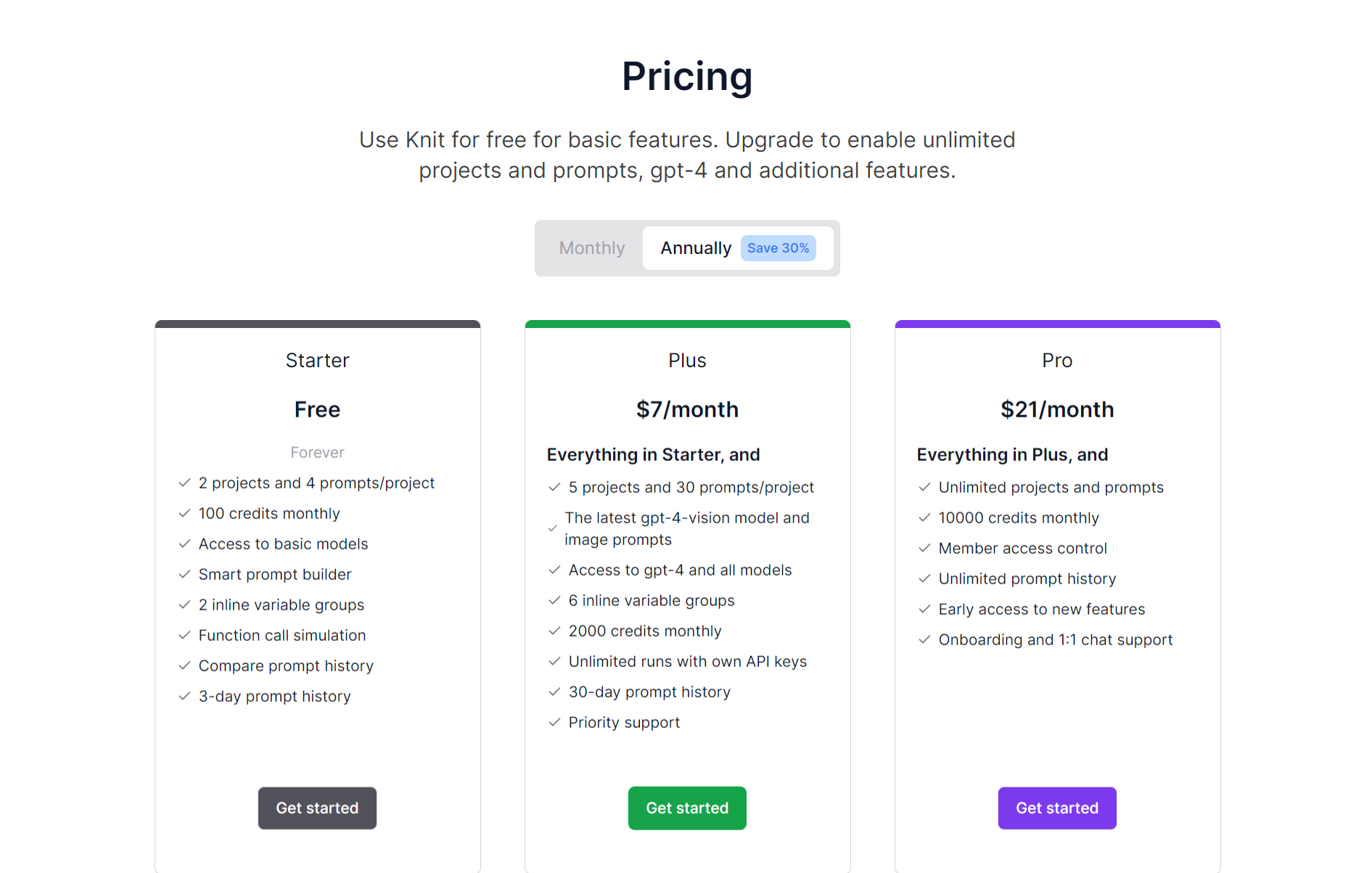 Knit 提供多种定价方案,这些方案覆盖了从免费的基础功能到高级功能的不同需求,并提供了灵活的选择。用户可以根据项目规模、功能需求以及对信用点和历史记录的需求来选择最适合的定价方案,选择年付套餐最高可享 30% 的折扣。