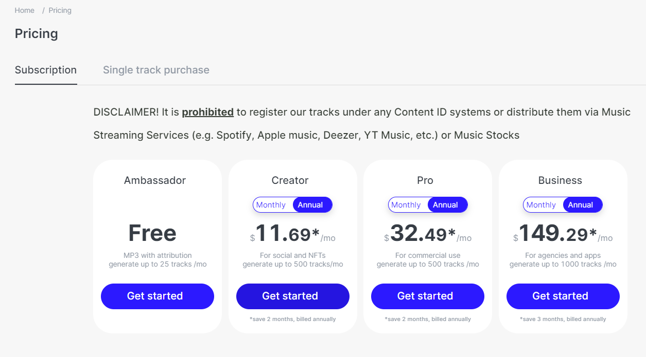 Mubert可能提供免费版本供用户试用,以体验其基本的音乐创作功能和音乐生成能力。Mubert可能提供订阅制服务,用户需要支付一定的月费或年费以享受更多的功能和权限。订阅制通常包括更多的音乐风格选择、无限制的音乐生成、更高的音乐质量、专属的客户支持等。Mubert也提供一次性购买的方式,用户支付一定的费用即可永久获得软件的使用权。对于开发者和品牌,Mubert可能提供API接口供其集成到自己的产品或平台中。这种情况下,Mubert可能会根据API调用的次数或数据量收取一定的费用。
