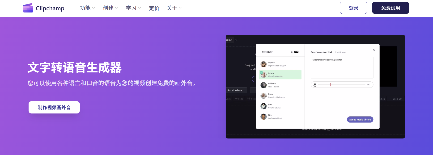 Clipchamp AI 旁白生成器是一个基于人工智能技术的文字转语音工具,它可以将用户输入的文字自动转换成自然流畅的语音旁白。这款工具提供了400多种语音选择,涵盖不同年龄、口音和性别的语音,