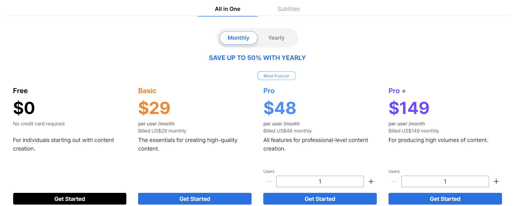 Pro版包含专业级内容创作的所有功能,48美元/月,288美元/年。