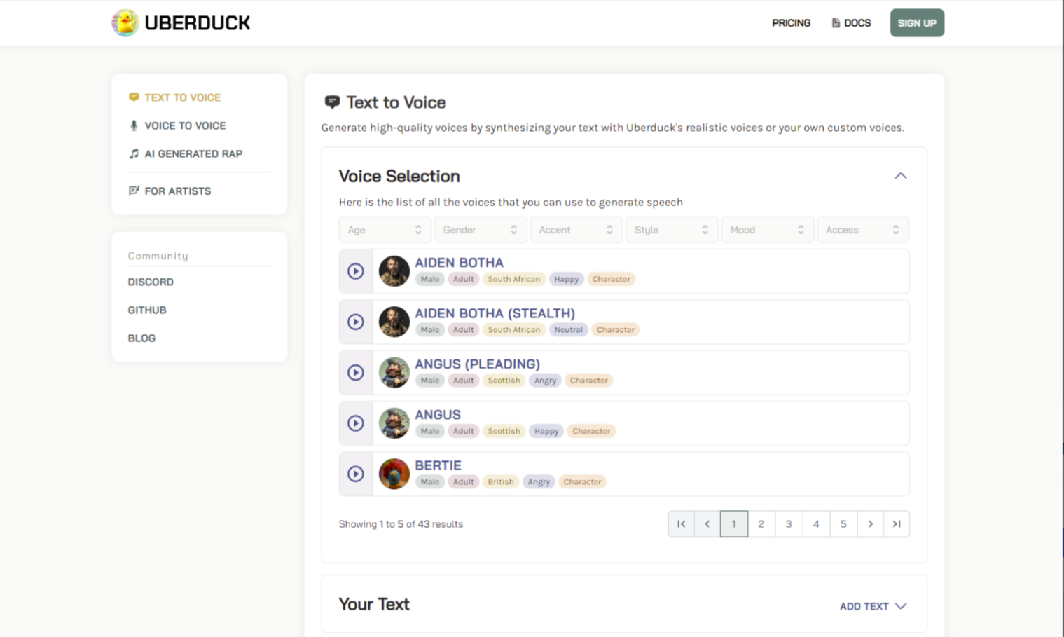 Uberduck Al是一个利用人工智能为用户提供文本转语音、语音自动化和合成媒体的高级工具的平台,包括从文本生成语音、创建说唱视频以及使用语音克隆进行商业或商业用途的能力。