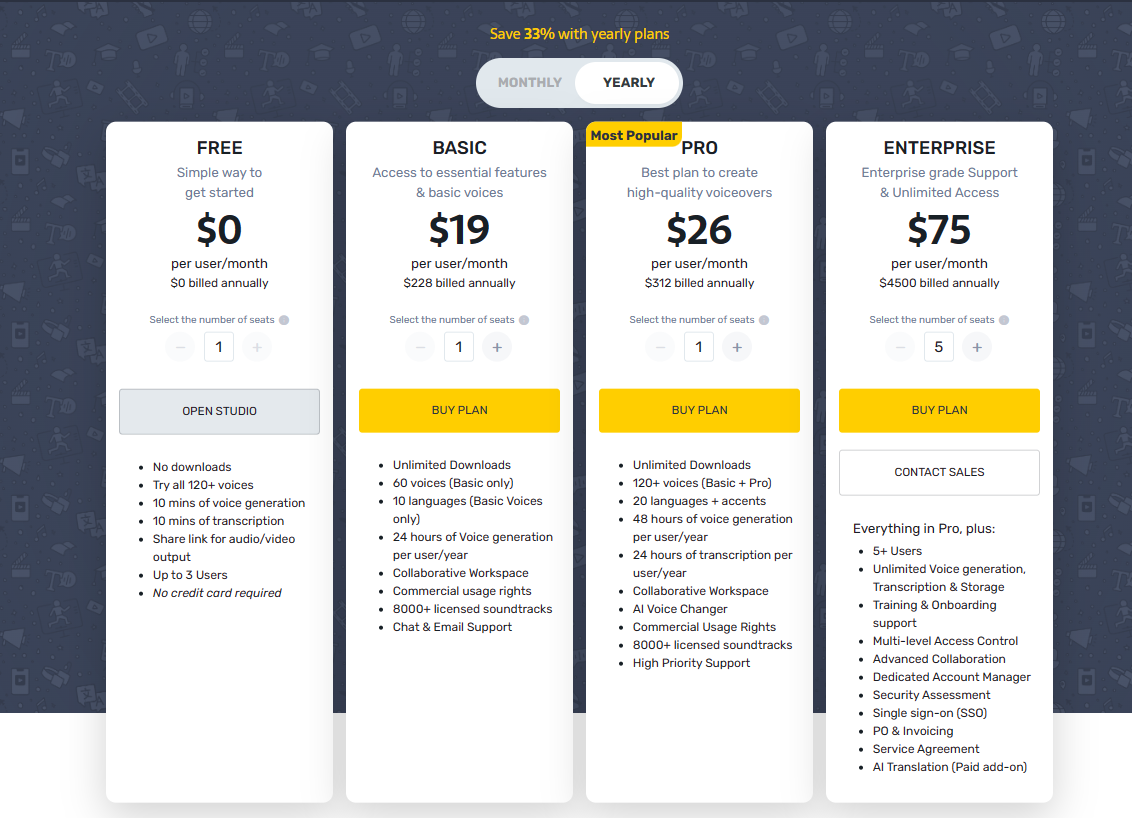 Murf AI的定价策略基于用户的需求和功能使用范围,提供了多种套餐选择。这些套餐包括免费版、基础版、专业版和企业版,以满足不同用户的需求。免费版没有下载但可以尝试所有120多种声音和10分钟语音生成并可以转录10分钟;基础版可以无限下载可用60种声音(仅限基本)、10种语言(仅限基本语音);专业版可以用120多种声音(基本版 + 专业版)和20种语言+口音;企业版在专业版的基础上还有5+ 用户、无限的语音生成、转录和存储、培训和入职支持等。