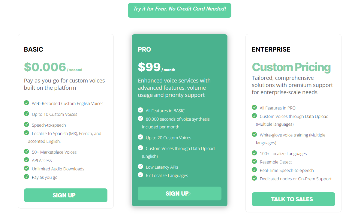 resemble.ai提供了两种主要的产品价格方案,分别是基础版和专业版。基础版是按照使用量付费的方式,适合于需要定制少量声音的用户。专业版是根据客户的需求和规模定制的方式,适合于需要大规模部署和应用声音的用户,第三种方案专门为企业定制定价。
