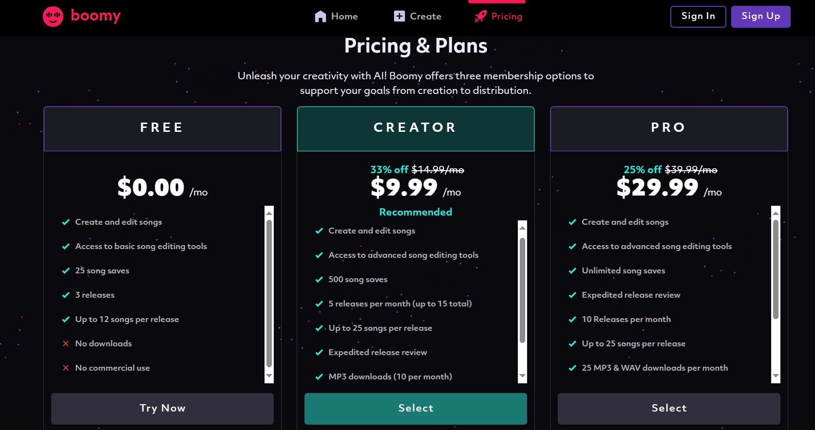 Boomy的定价分为免费版、创作者版和专业版。免费版可以使用基本歌曲编辑工具,有歌曲和版本限制;创作者版可以使用高级歌曲编辑工具,并可以下载MP3版本,但不能做商业用途;专业版可以无限保存歌曲,并可以下载WAW版本,可做商业用途。