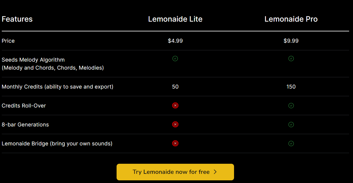 lemonaide有精简版和专业版两种收费模式,精简版只有种子旋律算法和每月50积分;专业版不仅有种子旋律算法和每月150积分,还有8小节世代、Lemonaide Bridge(自带声音)。