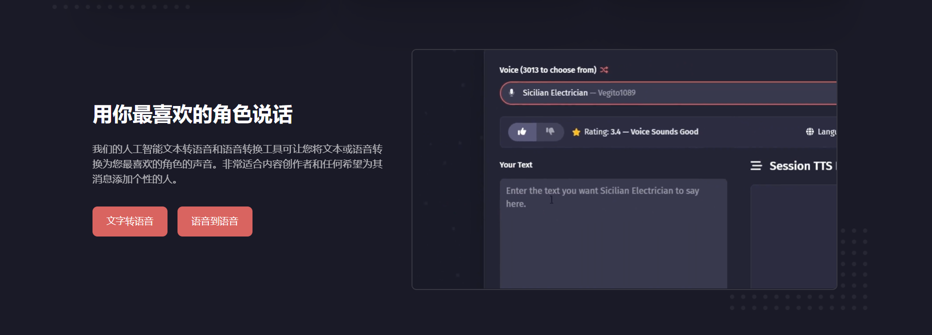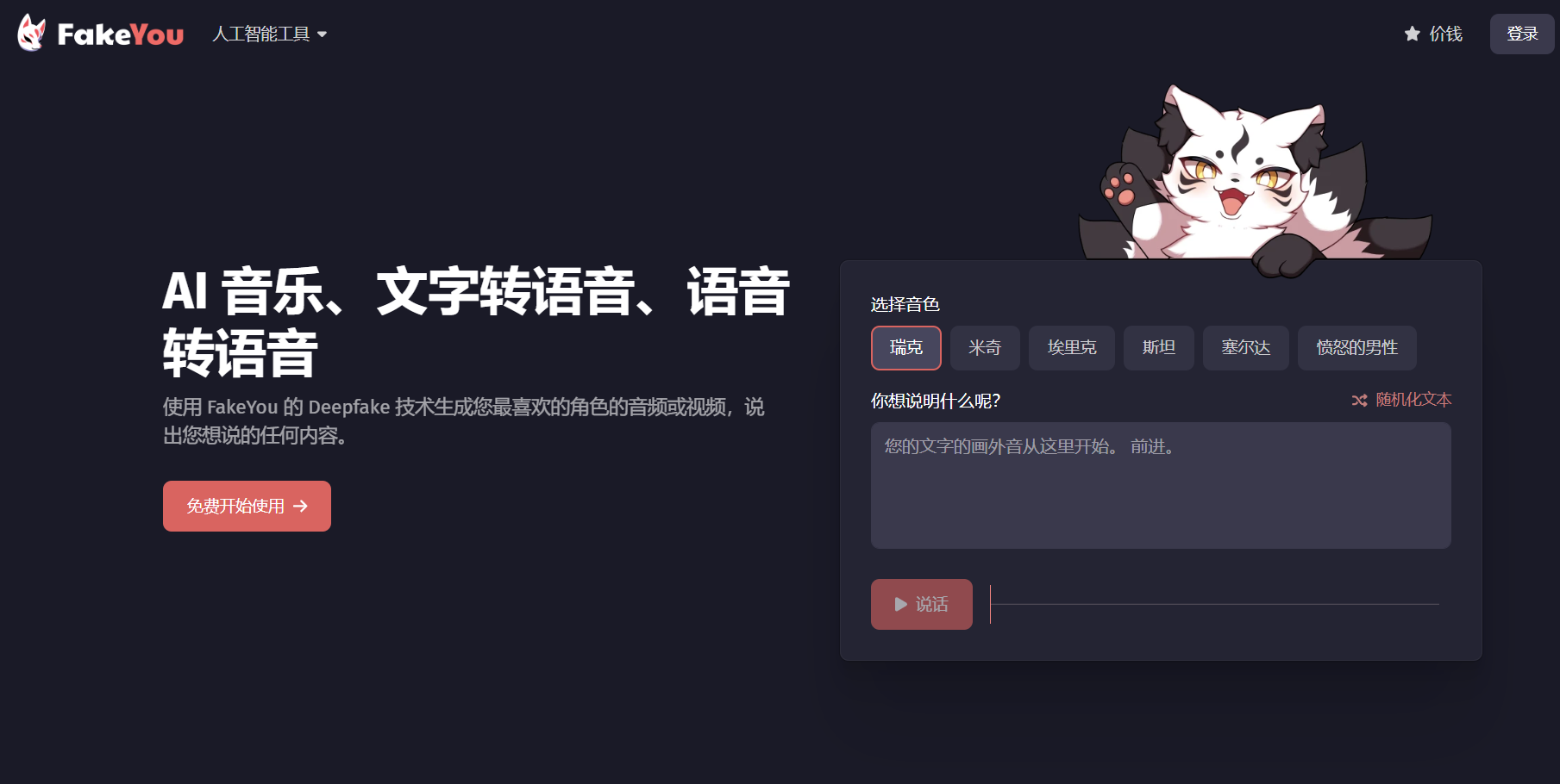 FakeYou 利用经过数小时语音数据训练的先进深度学习模型来生成逼真、自然的声音。用户可以输入文本或音频,并选择众多支持的语音选项之一,例如名人、卡通、游戏角色等。