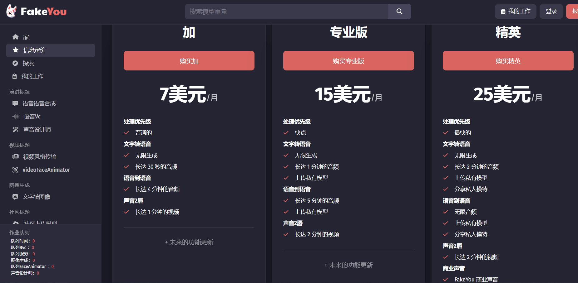 分为加、专业版和精英三种价位,区别主要在于处理优先级的快慢,文字转语音以及语音到语音的时长限制,另外精英版有商业声音的权限。