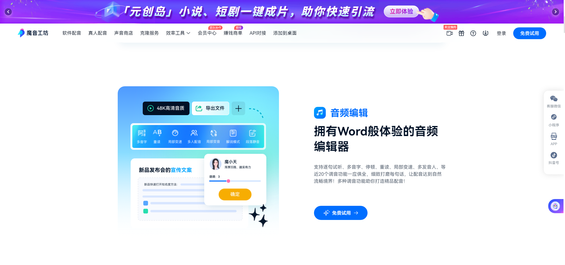 魔音工坊,作为一款集创新技术与艺术创意于一身的音频制作神器,它重新定义了音频内容的创作边界。无论是专业音频师还是音频创作爱好者,都能在魔音工坊中找到灵感与便利。该平台集成了先进的音频编辑工具、海量的音效库以及智能合成技术,让用户能够轻松实现音频的剪辑、混音、变声、降噪等复杂操作,同时快速融入各种氛围音效和背景音乐,让作品更加丰富多彩、引人入胜。更值得一提的是,魔音工坊还融入了AI辅助创作功能,能够根据用户需求智能推荐音效组合,甚至生成独特的旋律与节奏,极大地提升了音频创作的效率与创意空间。无论是广告配音、短视频制作、有声书录制还是游戏音效设计,魔音工坊都能成为你不可或缺的创意伙伴。