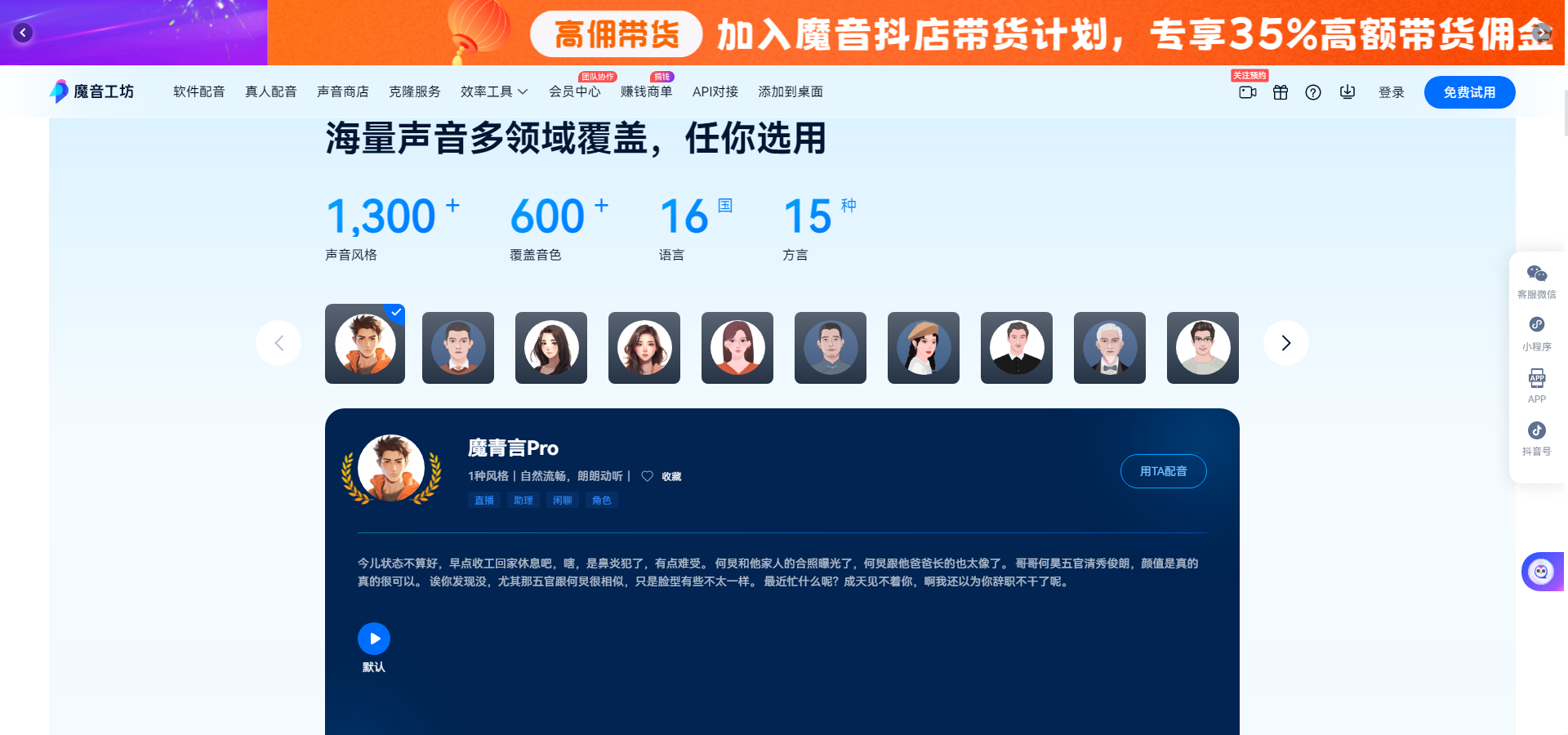 智能合成与创作:魔音工坊融入了AI技术,支持智能合成音频内容。用户可以通过简单的操作,如输入文字或选择特定的音乐风格,让AI自动生成符合要求的旋律、节奏或背景音乐。此外,平台还提供了多种创意工具,如变声器、回声效果等,帮助用户创造出独一无二的音频效果。