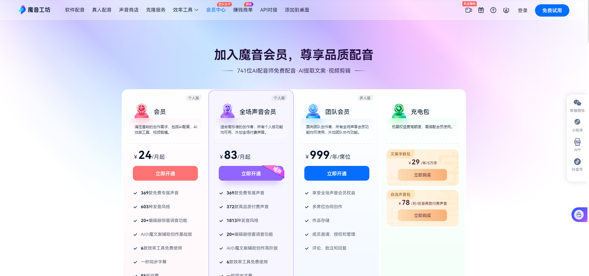魔音工坊提供了四种不同档次的定价方案,包括个人版会员、个人版全场声音会员、多人版团队会员和充电包。