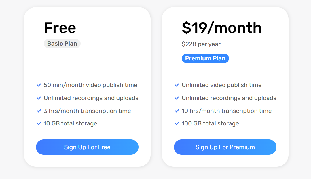 Visla提供两种定价方案,以满足不同用户的需求。免费的基础计划包括每月50分钟的视频发布时间、无限的录制和上传次数、每月最多3小时的转录时间以及10GB的总存储空间,全部免费提供。对于需要更多功能和资源的用户,高级计划以每月19美元或每年228美元的价格提供,提供无限的视频发布时间、无限的录制和上传次数、每月最多10小时的转录时间以及100GB的总存储空间。用户可以根据自己的需求和预算选择最适合他们的计划,无论是选择免费的基础计划还是高级计划的增强功能。