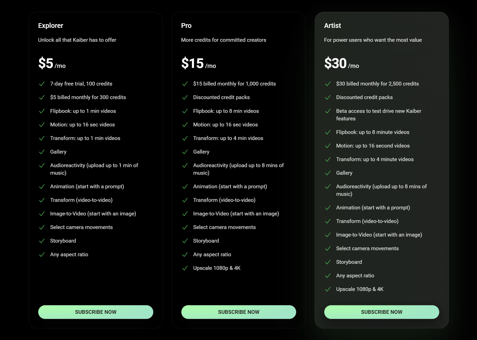 Kaiber提供了多种灵活的定价计划,满足不同用户的需求。Explorer计划每月仅需5美元,或选择年付方案可享受高达33%的折扣。此计划提供了丰富的功能,包括Flipbook、Motion、Transform、Gallery、Audioreactivity等,并附带7天免费试用和100个积分。Pro计划每月15美元,提供更多积分,适合有更多创作需求的用户。而Artist计划则为强大的用户提供了最大的价值,每月30美元,提供更多积分、折扣以及测试新功能的机会。无论是初学者还是专业人士,Kaiber的定价计划都能满足用户的需求,为他们提供高品质的创作体验。