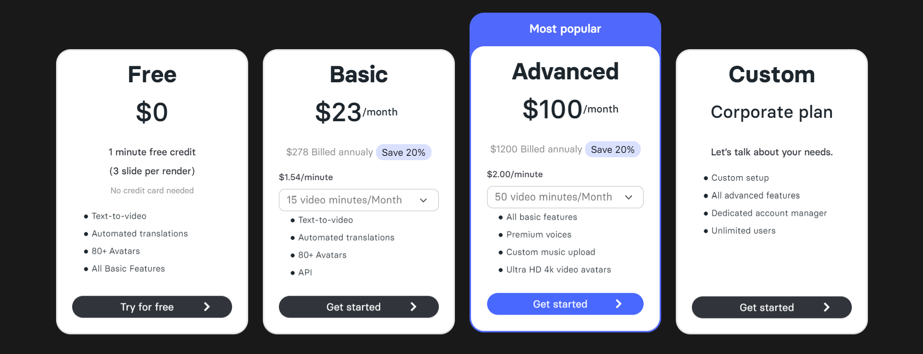 Elai.io 提供多种价格方案,以满足不同的需求和预算。免费计划提供每月1分钟的免费信用额度,让用户体验基本功能,如文本转视频、自动翻译以及访问各种角色扮演者,而无需任何预付费用或承诺。Basic计划为用户提供每月15分钟的视频创作时间,包含所有基本功能以及API访问,适用于需要更广泛视频创作能力的用户。Advanced计划是最受欢迎的选择,提供每月50分钟的视频创作时间,额外增加了高级功能,如高级语音、自定义音乐上传和超高清4K视频角色扮演者,非常适合追求更高定制性和视频质量的用户。企业用户可以选择定制的企业计划,根据特定需求定制,包括定制设置、所有高级功能、专门的客户经理和无限用户,为寻求大规模视频制作解决方案的组织提供全面的解决方案。