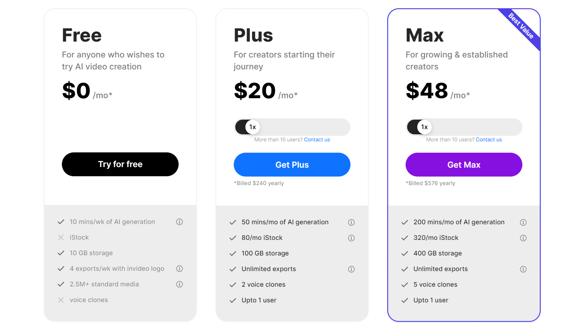 Invideo AI 提供了灵活的定价选项,以满足不同用户的需求。免费版适合希望尝试AI视频创作的用户,提供每周10分钟的AI生成时间,10GB存储空间,每周4次带有InVideo标志的导出,以及超过2.5M的标准媒体资源。Plus版适合创作者开始他们的创作之旅,每月提供50分钟的AI生成时间,80个iStock资料库下载,100GB存储空间,无限导出,以及2个语音克隆。Max版适合成长和已建立的创作者,每月提供200分钟的AI生成时间,320个iStock资料库下载,400GB存储空间,无限导出,以及5个语音克隆。用户可以根据其需求和预算选择合适的计划,Invideo AI 还提供年度订阅,享受20%的折扣。