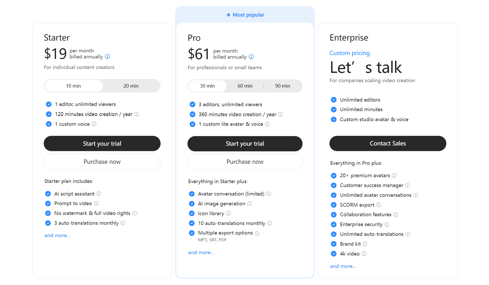 Colossyan 提供三种不同的定价方案,分别针对不同的用户需求。Starter 计划每月 $19,年度结算,适合个人内容创作者,提供每年 120 分钟的视频制作时间,还包括 AI 脚本助手、文本提示生成视频、自定义语音等功能。Pro 计划每月 $61,年度结算,适用于专业人士或小团队,提供每年 360 分钟的视频制作时间,附加功能包括头像对话、AI 图片生成、多种导出选项等。企业定价方案根据需求定制,提供无限制的视频制作时间、高级头像选择、无限头像对话、协作功能、企业安全性等,确保企业视频制作需求的全面满足。