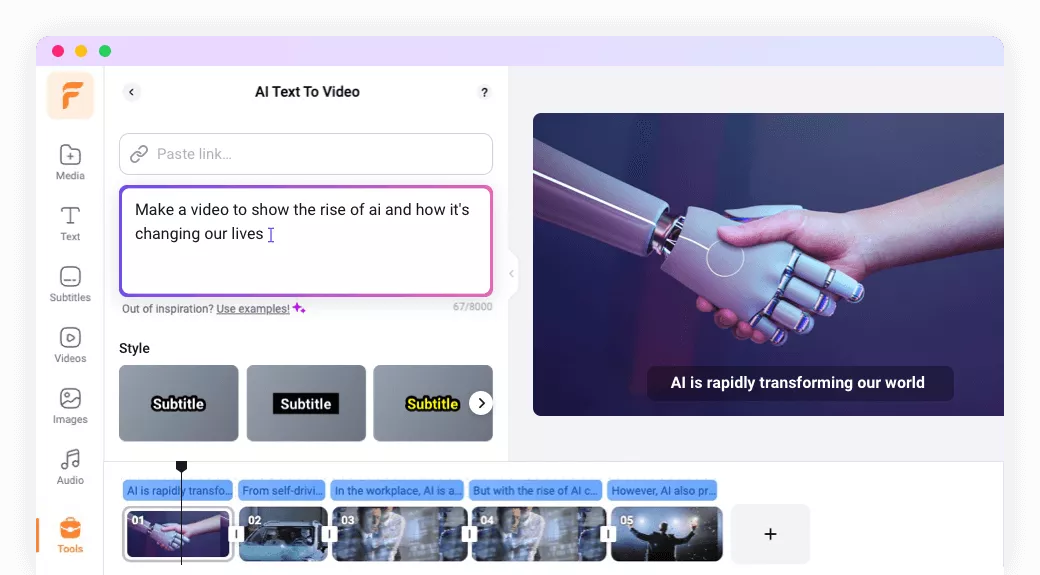 FlexClip内置了AI工具,使视频制作过程更加智能化和高效。用户可以利用AI文字转视频功能快速生成视频内容,或者借助AI生成视频脚本提升创作效率。同时,AI图片生成器为视频添加生动的视觉效果,节省了大量的时间和精力。这些AI工具使视频创建过程变得轻松愉快。