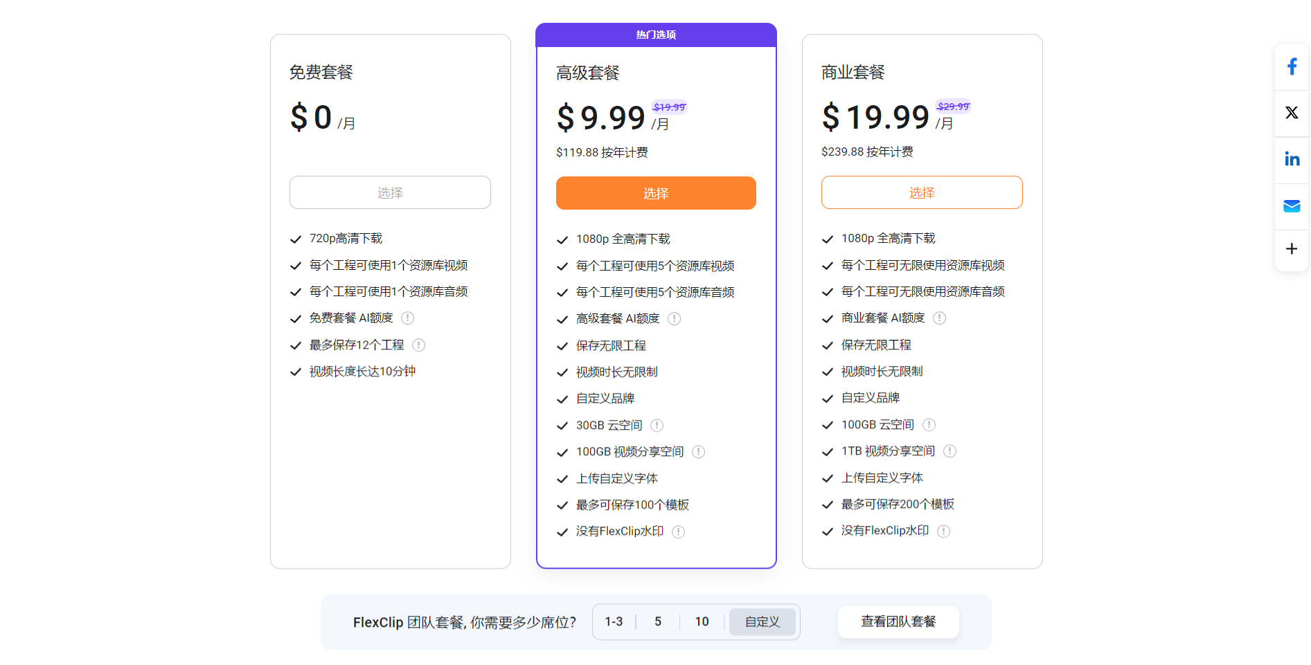 FlexClip提供多种套餐选择,满足不同用户的需求。免费套餐适合个人用户或小团队,提供720p高清下载、每个工程可使用1个资源库视频和音频等功能。高级套餐提供更多高级功能,包括1080p全高清下载、自定义品牌、30GB云空间等,适合中小型企业或需要更多功能的用户。商业套餐则提供更多资源和功能,如1TB视频分享空间、上传自定义字体等,适合大型企业或需要大量视频创作和分享的用户。用户还可以根据团队规模选择团队套餐,享受更多优惠和定制化服务。