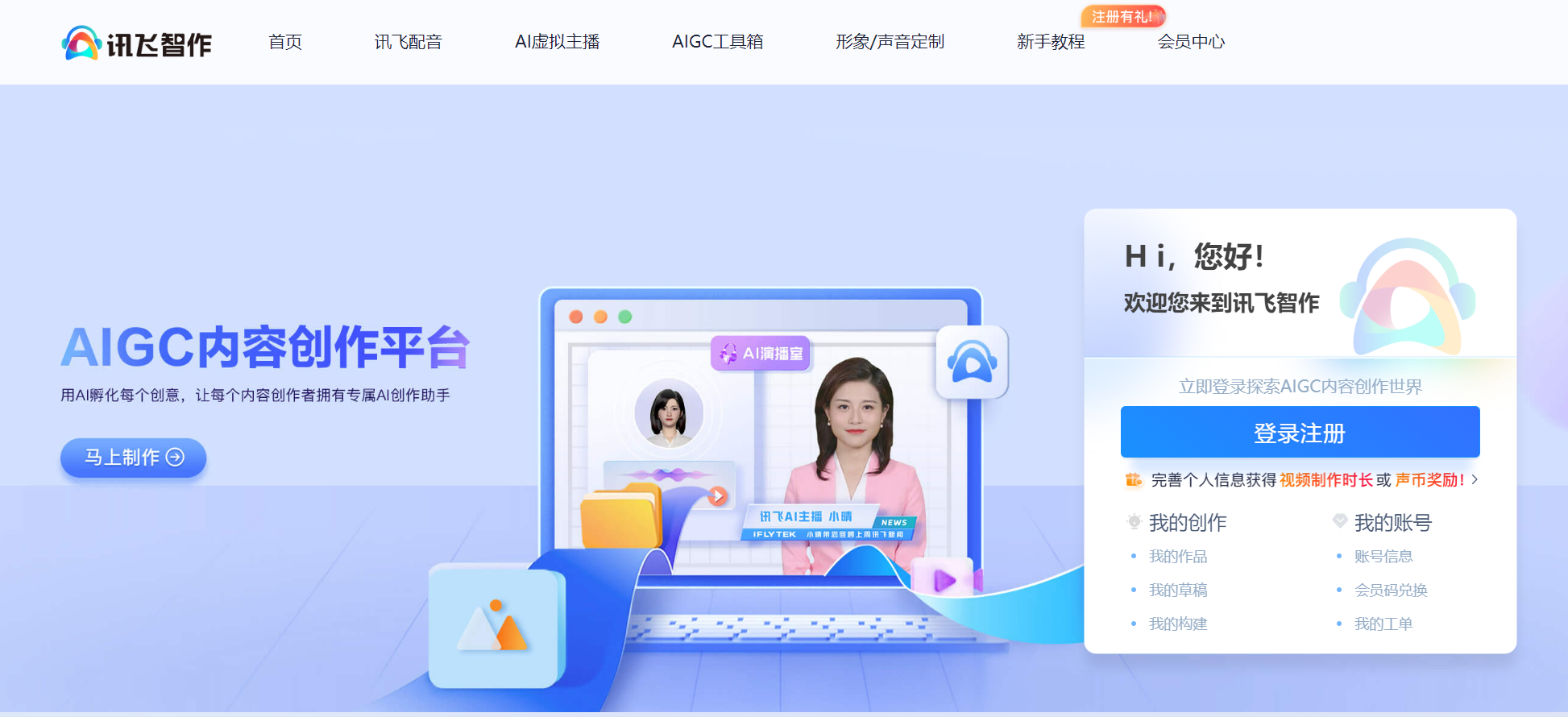 讯飞智作:在音视频制作方面具有较强的实力,提供多场景、多情感、多语种的AI主播,支持用户通过录制少量视频快速生成高质量的音视频内容。其智能配音功能覆盖多种音色、方言和语种,适用于纪录片、新闻、短视频等多种场景。