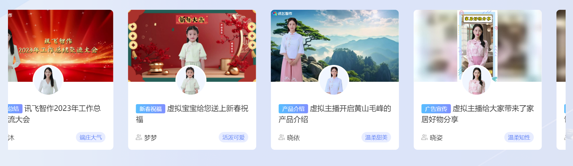 讯飞智作:主要面向内容创作者、媒体、企业等用户,提供音视频制作相关的解决方案。通过与多个领域的合作伙伴建立合作关系,讯飞智作在媒体、金融、智慧文旅、企业数字化、智慧政务等多个领域得到了广泛应用。