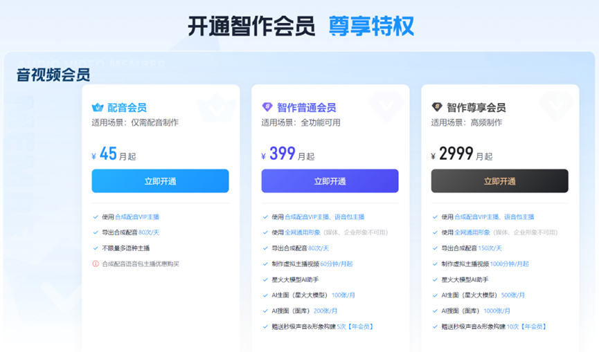 3.智作尊享会员:2999元/月,该方案包括最多每天可制作1500分钟视频、免费IP音库定制、免费使用合成配音VIP主播和语音包合成配音主播、使用通用虚拟主播形象、免费导出合成配音150次/天、免费制作虚拟主播视频20次/天,以及定制自训练合成配音主播1个。