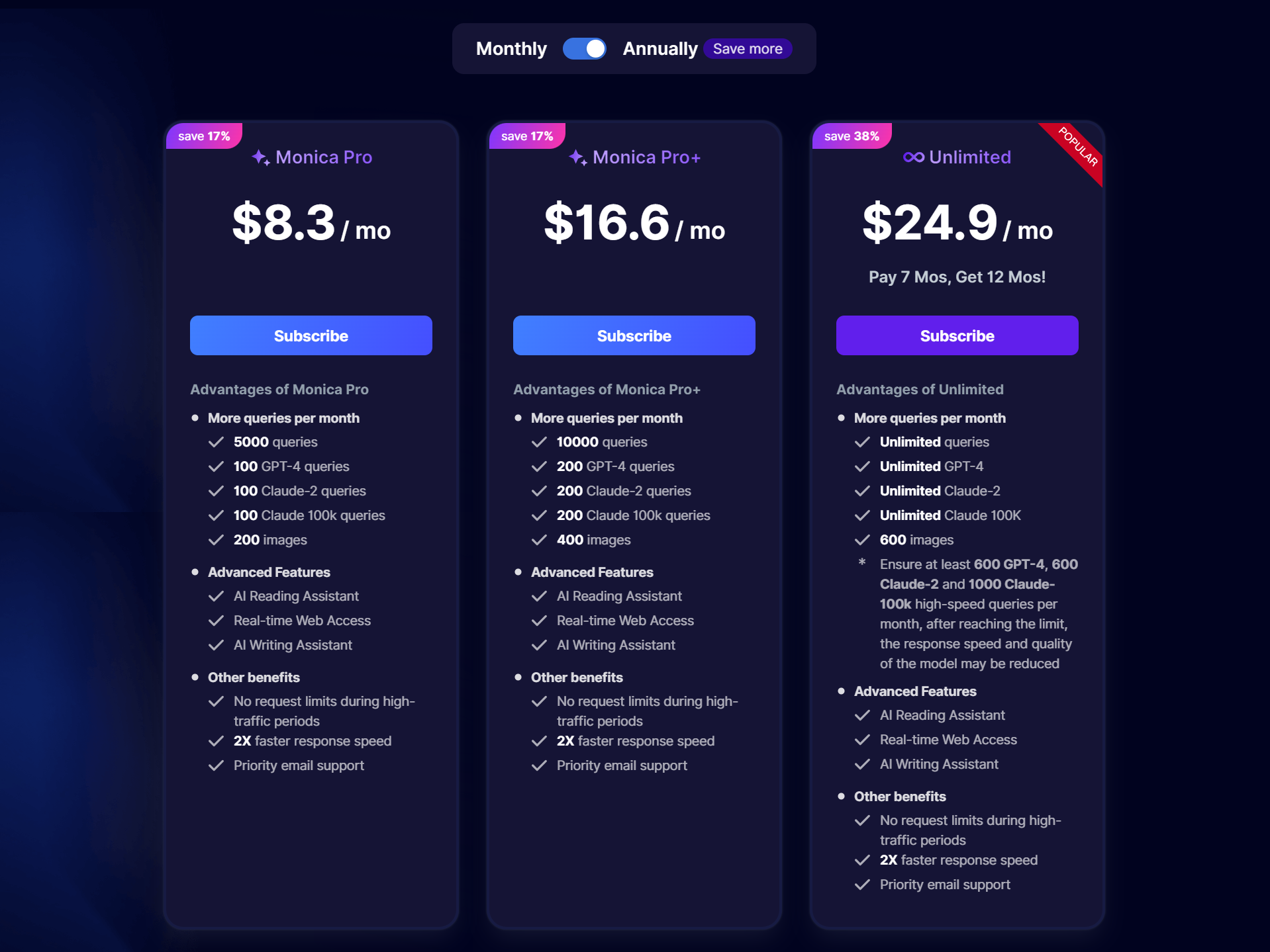 Monica 免费版每天可获得 30 次提问的额度。若您需要绘画、GPT-4、联网等专业功能,可升级至 Pro 版本,同时享有更多的查询次数。