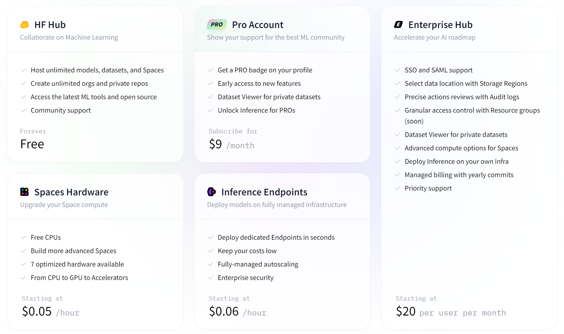 Hugging Face提供了一系列定价选项,以满足不同用户和组织的需求。HF Hub旨在进行机器学习协作,提供免费访问无限的模型、数据集和空间,以及社区支持。用户可以选择每月9美元的PRO账户,获得PRO徽章、提前访问功能和用于私人数据集的数据集查看器等好处。对于企业级需求,企业Hub提供了额外的功能,如SSO支持和精确的操作审查,起价为每用户每月20美元。高级计算选项的空间从每小时0.05美元开始,而用于部署模型的推理端点从每小时0.06美元开始,确保了可扩展和成本效益的AI协作和计算解决方案。