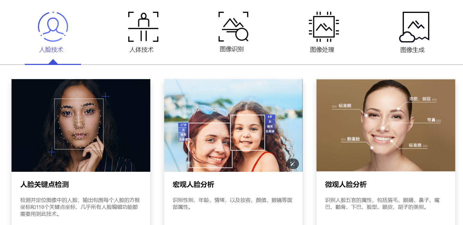 人脸技术:提供人脸关键点检测功能,能够检测并定位图像中的人脸,输出包围每个人脸的方框坐标和118个关键点坐标,几乎所有人脸编辑功能都需要用到此技术。此外,还可以进行宏观人脸分析,识别性别、年龄、情绪,以及妆容、颜值、眼镜等面部属性。