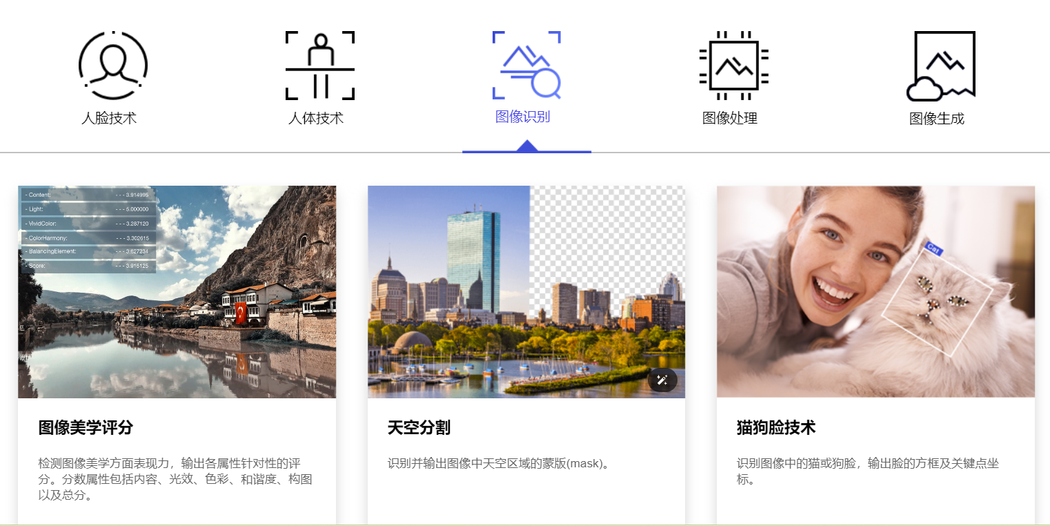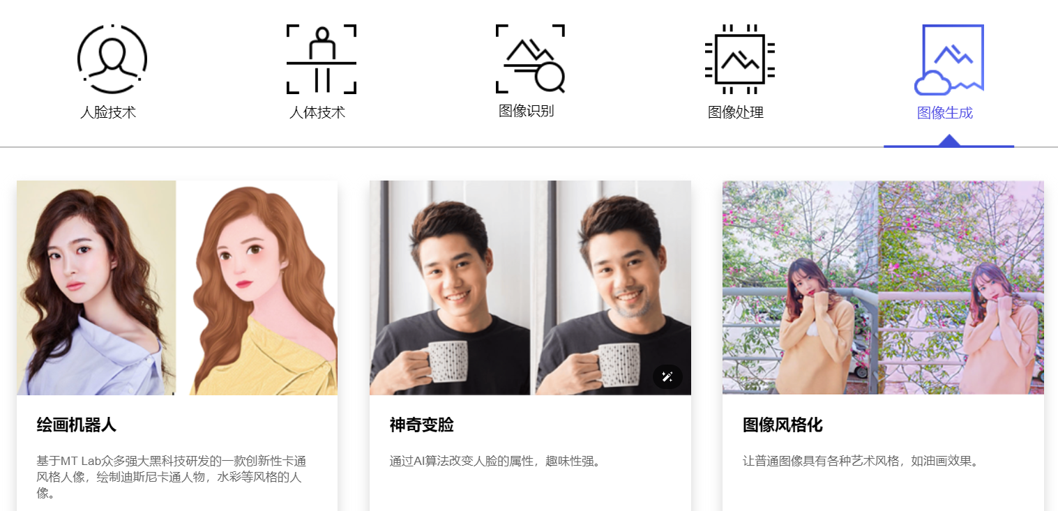 美图公司推出的AI服务平台,专注于人脸技术、人体技术、图像识别、图像处理、图像生成等核心领域,为客户提供经市场验证的AI算法服务和解决方案