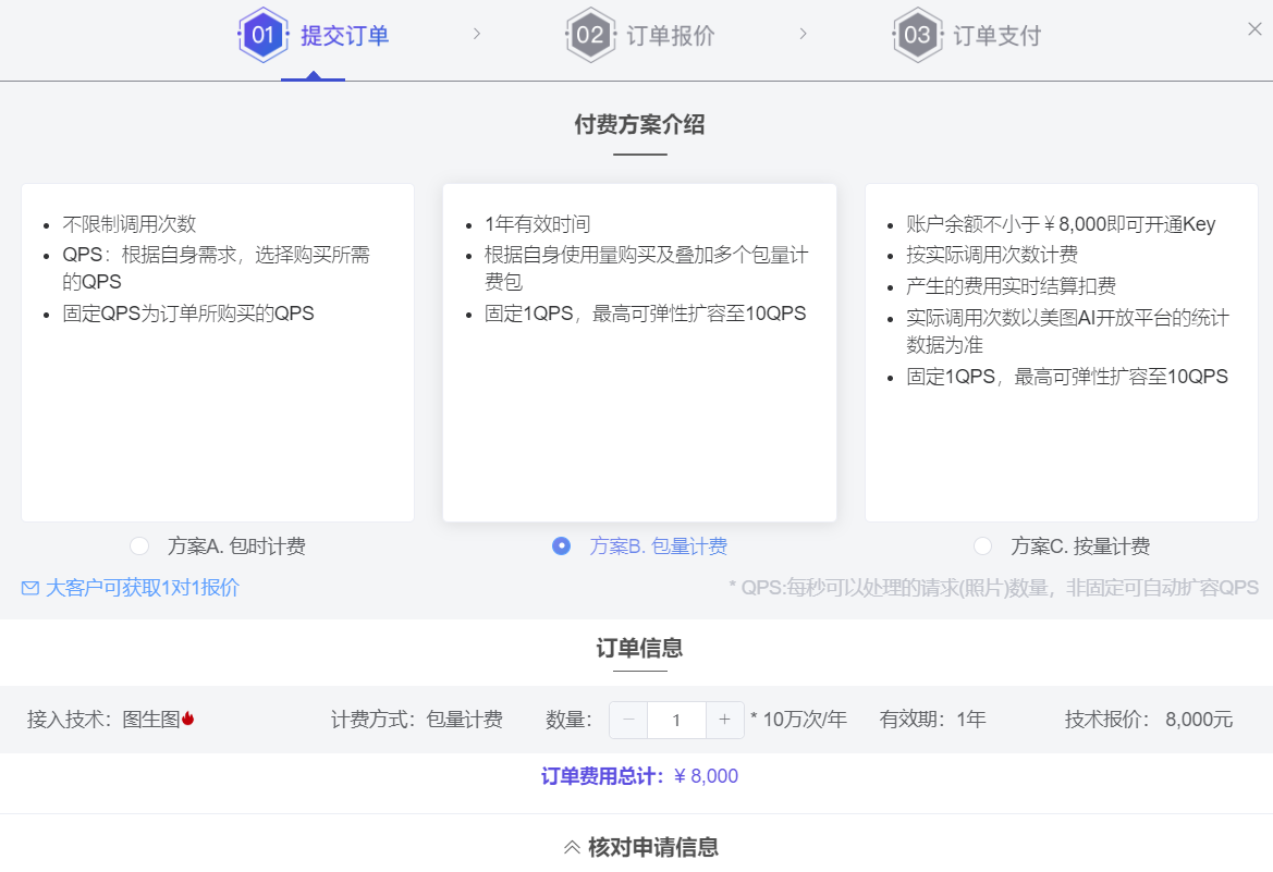 提供定制定价服务,同时包含不同收费方式:包时计费、包量计费、按量计费。具体付费方案可进入官网进行查看
