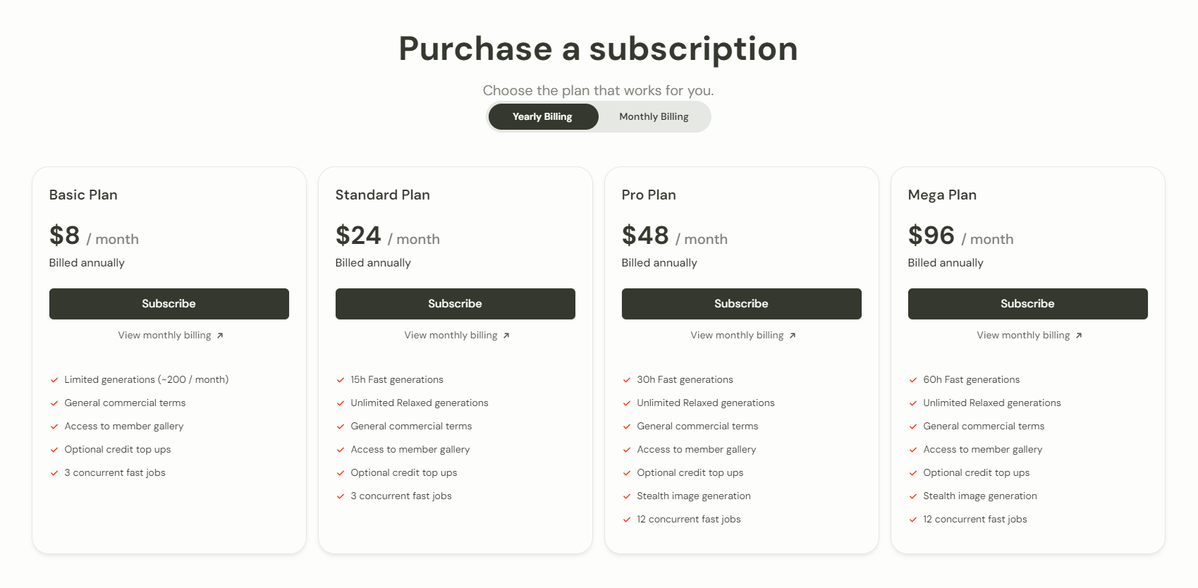 Midjourney 提供了前 25个 免费的提示供使用,但您需要在 Discord 服务器上注册账户并参与社区才能开始使用。在使用机器人 25 次后,Midjourney 提供了四种订阅计划供选择,您可以根据需求选择适合您的订阅计划。