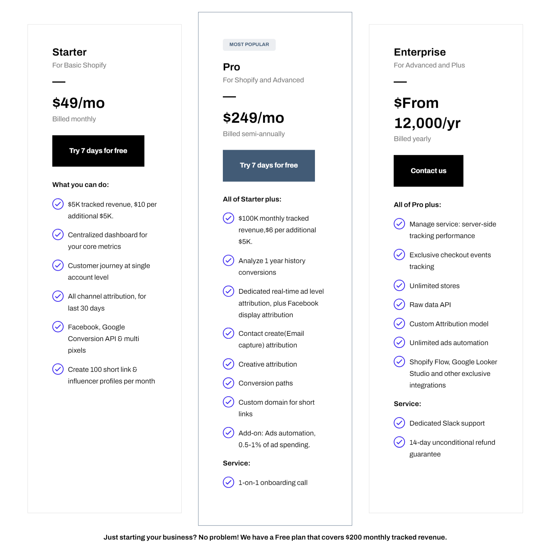 Attribuly 的定价策略旨在满足不同发展阶段企业的需求,提供了可扩展的计划选项。Starter 计划适合基本的 Shopify 用户,提供核心指标跟踪和多渠道归因功能;Pro 计划在此基础上增加了高级的转化分析和额外的归因功能,适合 Shopify 和高级用户;而企业版则为高级和尊贵用户提供了全面的分析和先进的集成解决方案,包括服务端追踪、自定义归因模型和无限广告自动化等功能,并提供专属的服务支持和独家集成,以优化多个商店的业绩表现。