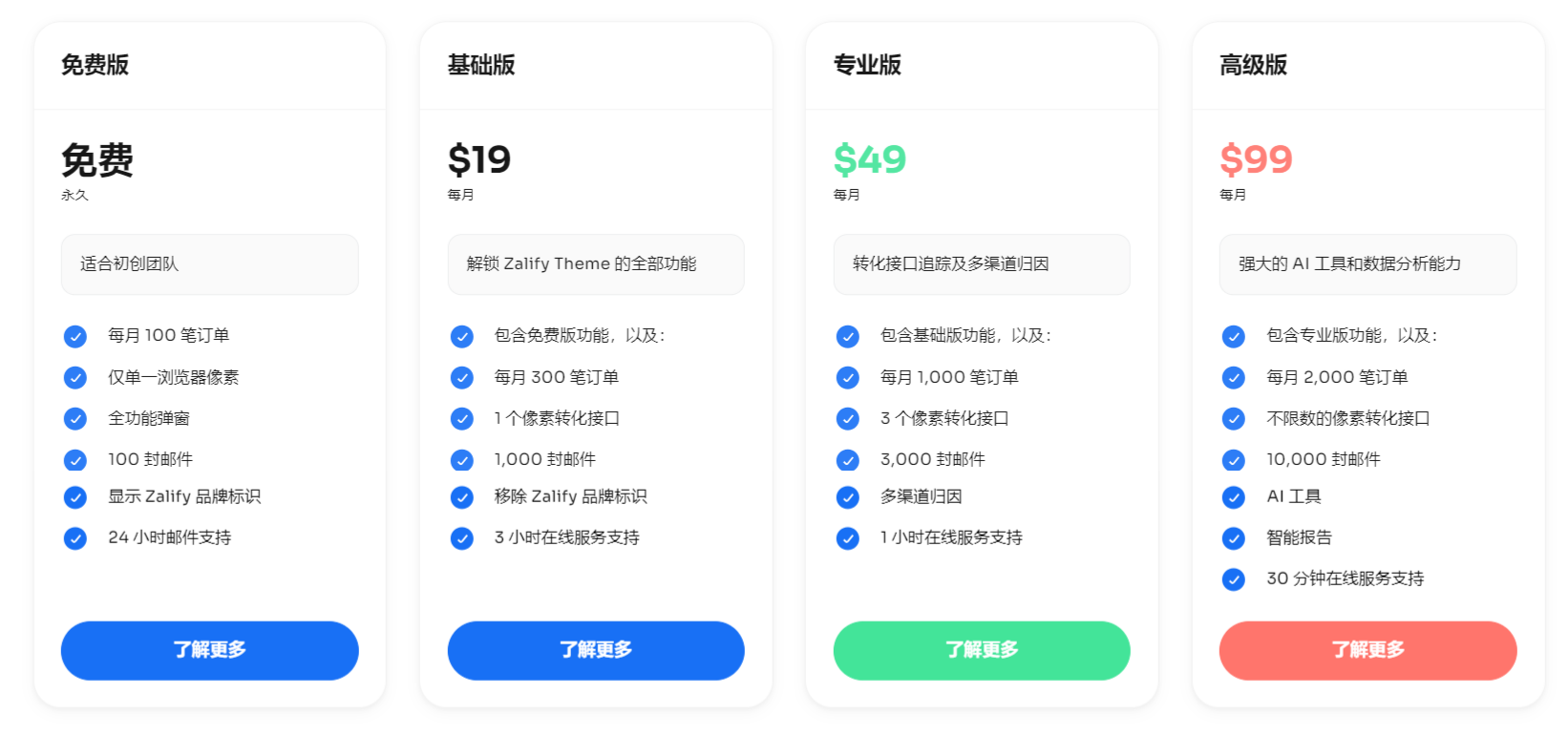 Zalify 提供多个定价方案,以满足不同规模企业的需求。免费版适合初创团队,包含基本功能;基础版解锁更多订单和邮件配额,移除品牌标识,提供更快的支持;专业版增加转化接口追踪和多渠道归因功能;高级版则配备强大的 AI 工具和数据分析能力,每个方案都提供逐步提升的功能和支持,确保企业在各个成长阶段都能找到合适的解决方案。