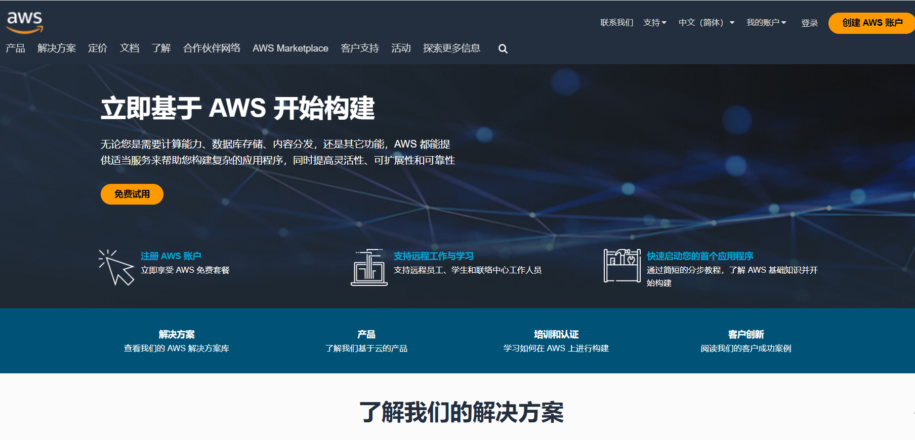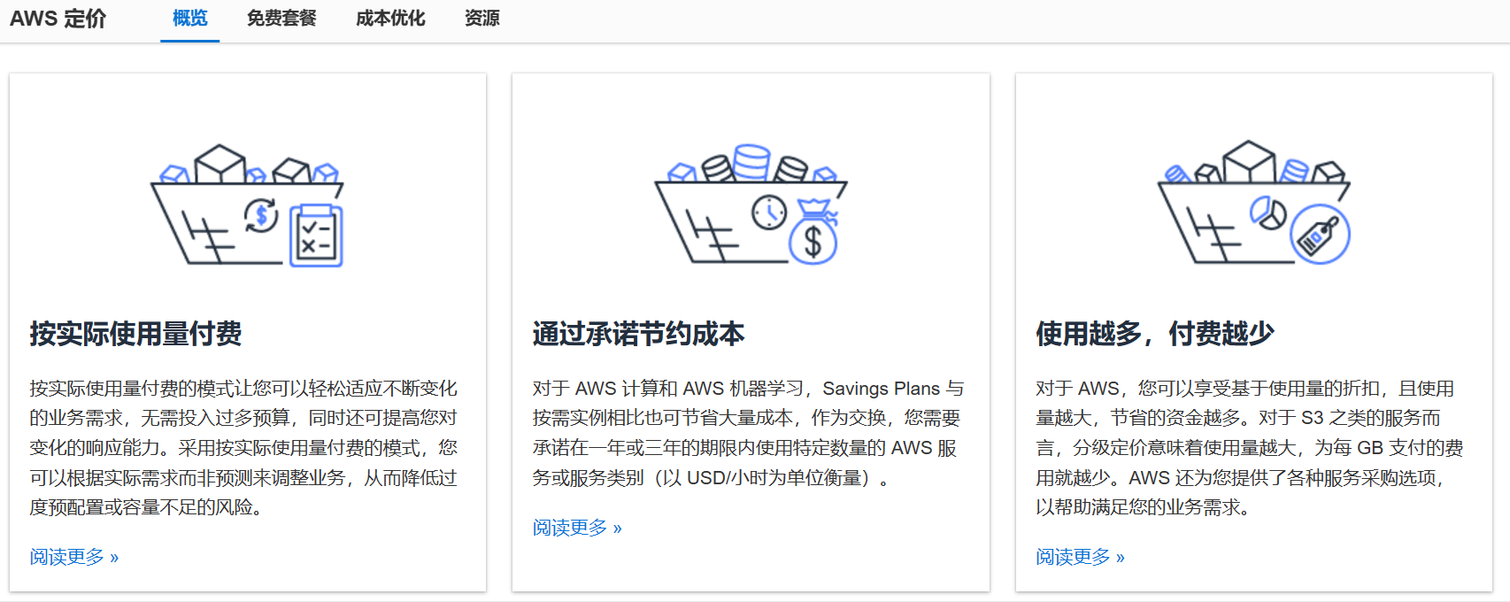 AWS的各种工具可提供最多长达3个月-永久的免费试用,付费套餐按照实际使用量付费,使用越多,付费越少,因产品和套餐过多,在这里不做详细介绍,具体内容可跳转到官网查询跳转链接