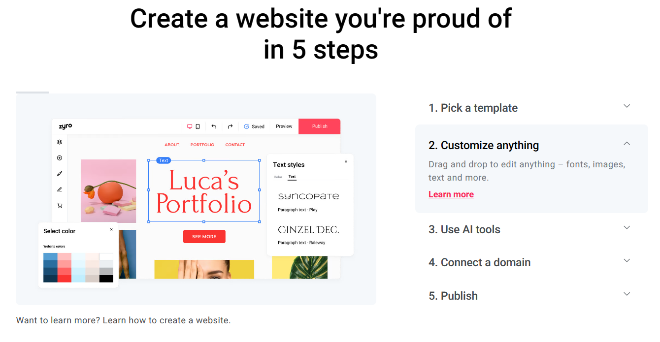 专业外观:Zyro的模板设计精美,具有现代感和专业性,让用户的网站在视觉上脱颖而出。
