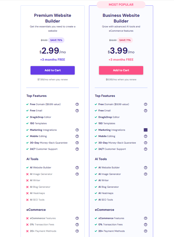 Zyro提供了多种定价方案以适应不同用户的需求。值得注意的是目前Zyro不再接受新用户注册,如果是新用户想要构建网站,需要前往Zyro的新软件:website Builder;订阅方案有两种,用户可根据需求选择订阅合适的方案。