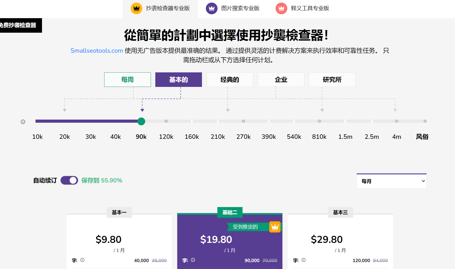 SmallSEOTools 提供免费使用的工具,但某些功能存在使用限制。为了超越这些限制,平台提供多种付费选项,价格从每月 9.8 美元起,支持不同文字数量的扫描。这些付费计划提供了更多高级功能,包括多层搜索、精确报告、API 支持等,满足用户对于更深入、更广泛检测和优质服务的需求。