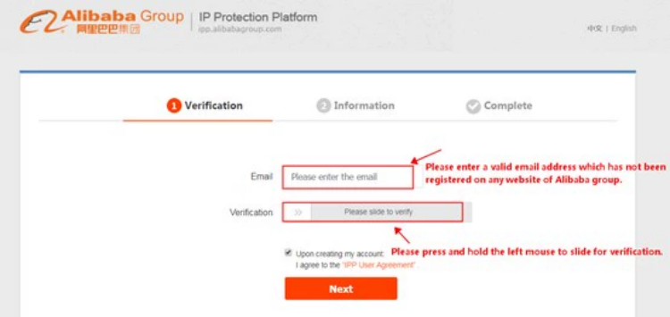 1)请访问IPP平台(https://ipp.alibabagroup.com/index.htm?language=en_US),然后单击右上角的“注册”按钮;