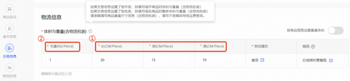 答:对于采购数量为1件商品的订单,即单品单件的订单,计算商家侧实际支付物流运费时是按包裹计费重(实重与体积重取大者)来运算的。My Alibaba后台商品发布页面中的尺寸重量也是基于单件/单批(设置售卖方式为“按批售卖”)商品要求商家填写的,只有填写含最小物流包装的尺寸重量才能保证运费计算准确。
