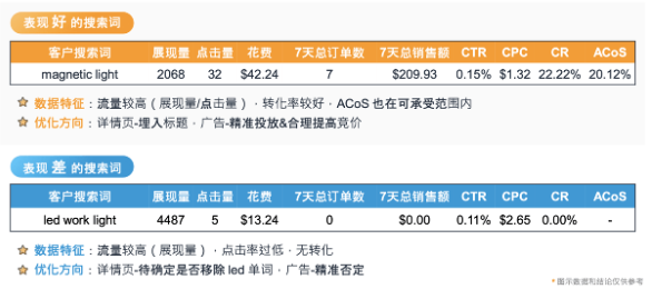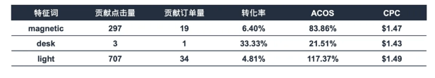 面对众多类似的搜索词时,可以换个思路——将这个搜索词拆解为三个核心单词:magnetic、desk、light,提取包含这些单词的所有相关搜索词,汇总数据,确定每个单词的贡献效果。