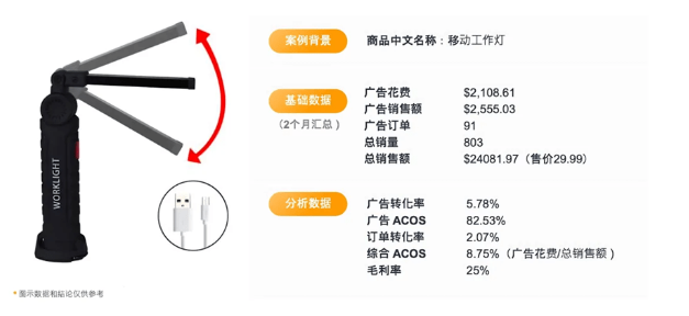 结合案例:分析该款“移动工作灯”产品两个月的广告数据,其中一个关键词 magnetic desk light,表现为45次展现、1次点击、1个订单,转化率达到100%,Acos仅为10%。