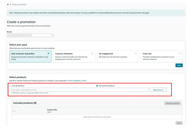 在您完成业务目标选择后,来到品牌定制促销(BTP)设置的第二步,选择计划促销的商品和受众人群。本次第二项重大更新,便是您不仅可选择“添加所有商品”,还能选择“添加特定商品”为特定ASIN设置促销。如您仍选择“添加所有商品”,则“排除特定商品”功能依然可用,可在复选框内输入具体ASIN来排除最多100个ASIN。您需注意以下几点: