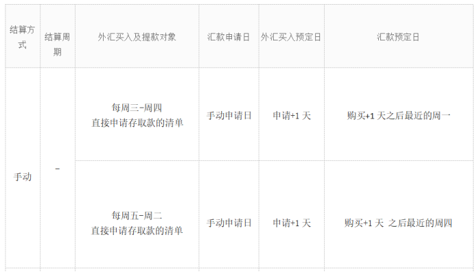 对0 - 24点之前所申请的帐目,在次日购入外汇,并在购买后最近的周一或周四汇往顾客的帐户