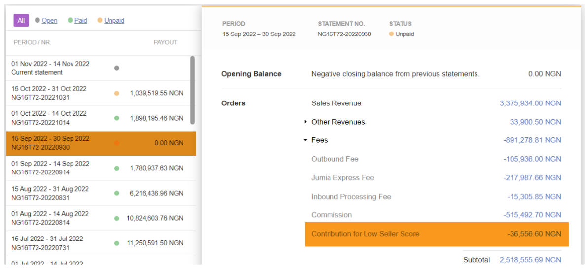 额外收取的运营费用在账单中显示为“Contribution for low seller score”